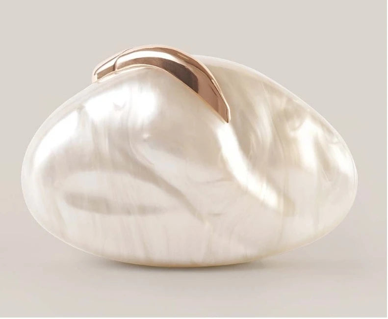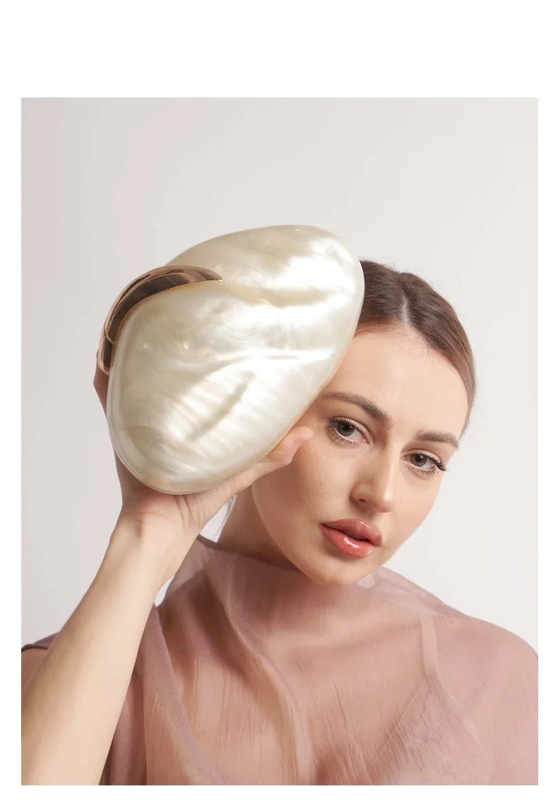This elegant oval egg-shaped clutch combines timeless sophistication with modern versatility. Crafted from premium acrylic with a lustrous pearl finish, the ivory frame exudes refined luxury perfect for weddings, evening galas, and special occasions. The compact design fits essentials while maintaining an understated elegance. Delicate floral detailing adds feminine charm without overwhelming the minimalist aesthetic. Ideal for beach outings or formal events, this mini handbag transitions seamlessly from day to night. The beige pearl tone complements any ensemble, making it a versatile investment piece for the discerning woman who values both style and practicality.