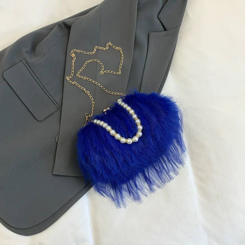 Furry Crossbody Bag with Pearl Handle Chain Plush Shoulder Bags for Women