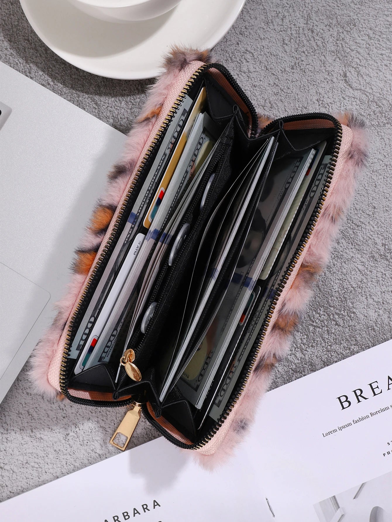 Plush Coin Purse, Stylish Leopard Print Long Wallet, Portable For Daily